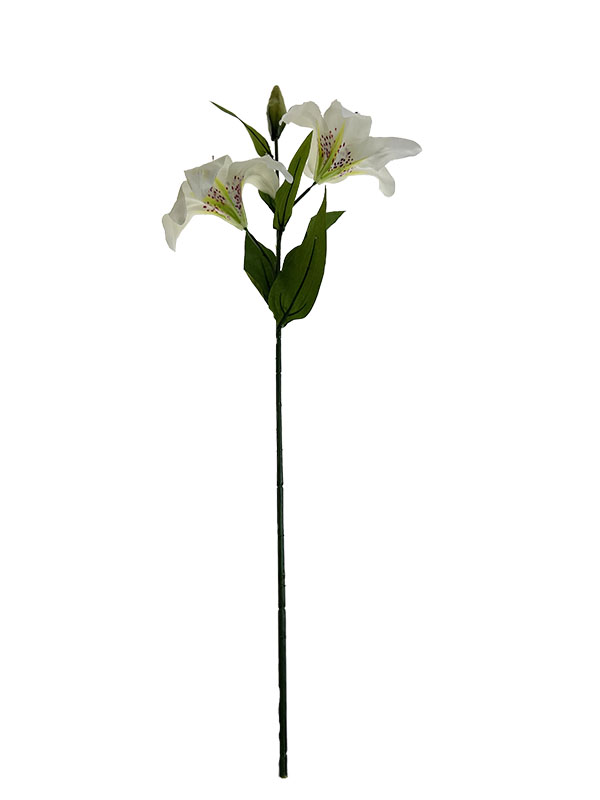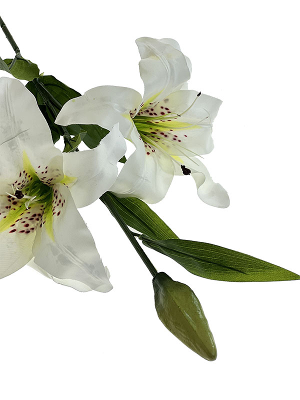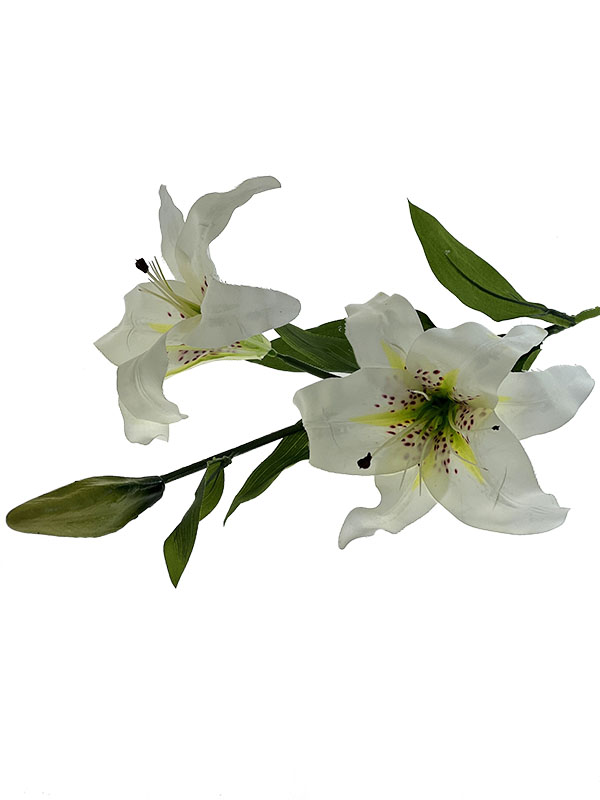 Wspaniała lilia na gałązce z 2 kwiatami i nierozwiniętym pąkiem będzie wspaniałą ozdobą każdej kompozycji kwiatowej. Bardzo dobre odwzorowanie żywego kwiatu i dobre jakościowo wykonanie.