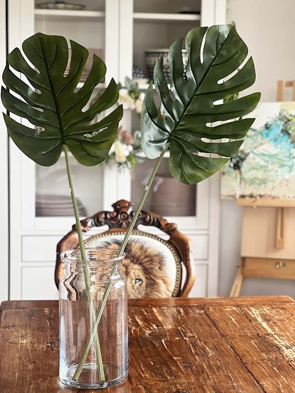 Liść Monstery to bardzo modny dodatek do każdego wnętrza w stylu skandynawskim lub zainspirowanym wystrojem Boho. Dodaj do aranżacji swojego wnętrza pozytywnej energii i odrobinę zieleni.   Ta wysoka dekoracja będzie spektakularnie prezentować się w każdym miejscu i w każdym pomieszczeniu. Dowolnie dobiera ilość , i naczynie w którym  umieścisz liście. Bardzo dobre wykonanie i jakość materiału z którego są wykonane.