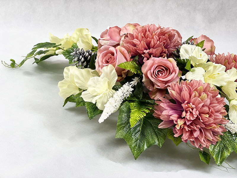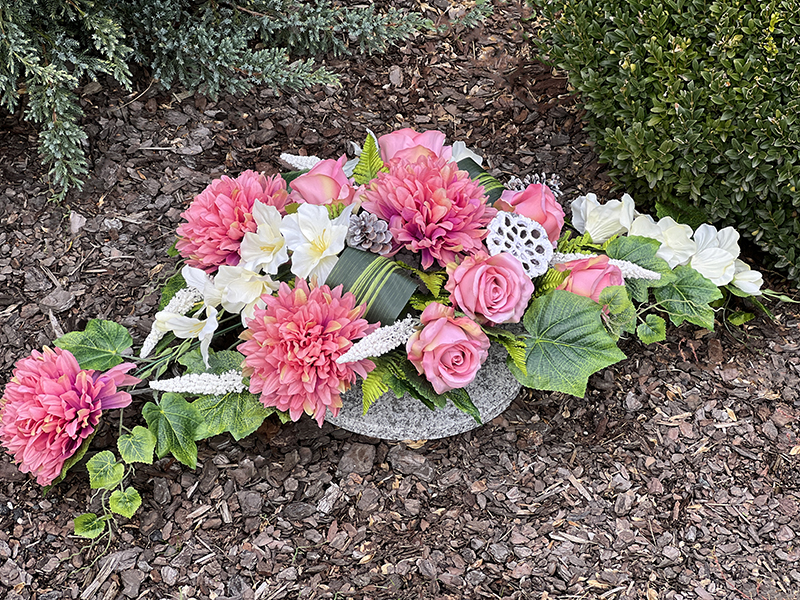 Gotowa kompozycja nagrobna osadzona jest w gipsowej zalewie, dzięki której cały czas trzyma formę. Doniczka w kolorze złotym o średnicy 15 cm. Do wyboru Mają Państwo dwie wielkości kompozycji w wielu wariantach kolorystycznych.