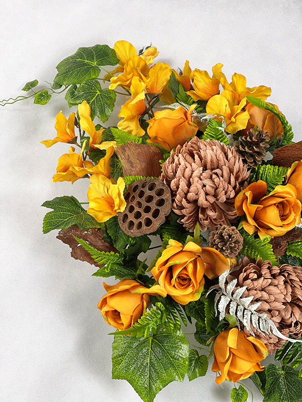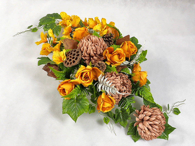Jak w tym roku gustownie przyozdobić pomnik na zbliżające się Święto 1 listopada? Rozwiązaniem jest unikatowa, gotowa kompozycja nagrobna w złotej doniczce, w odcieniach stonowanego brązu i żółtego. Duże chryzantemy, urocze róże oraz mieczyki tworzą zgraną przyjemną dla oka formę. Dekoracja jest odporna na jesienne warunki atmosferyczne i stabilna dzięki swej wadze.