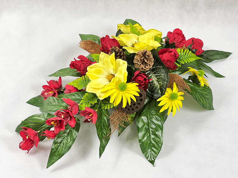 Jak w tym roku gustownie przyozdobić pomnik na zbliżające się Święto 1 listopada? Rozwiązaniem jest unikatowa, gotowa kompozycja nagrobna w złotej doniczce, w odcieniach czerwieni oraz żółci. Duże jasne chryzantemy, urocze róże oraz mieczyki tworzą zgraną przyjemną dla oka formę. Dekoracja jest odporna na jesienne warunki atmosferyczne i stabilna dzięki swej wadze.