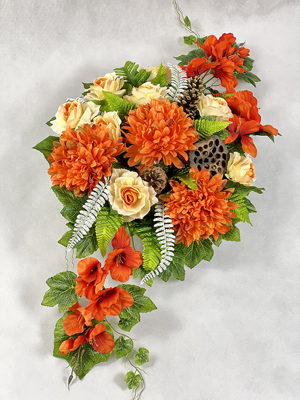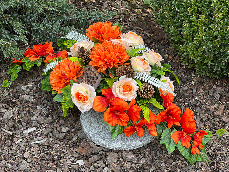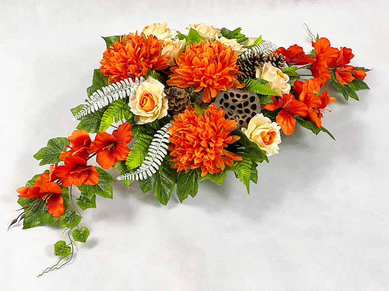 Jak w tym roku gustownie przyozdobić pomnik na zbliżające się Święto 1 listopada? Rozwiązaniem jest unikatowa, gotowa kompozycja nagrobna w złotej doniczce, w odcieniach wyrazistego pomarańczu oraz kremu. Duże chryzantemy, urocze róże oraz mieczyki tworzą zgraną przyjemną dla oka formę. Dekoracja jest odporna na jesienne warunki atmosferyczne i stabilna dzięki swej wadze.