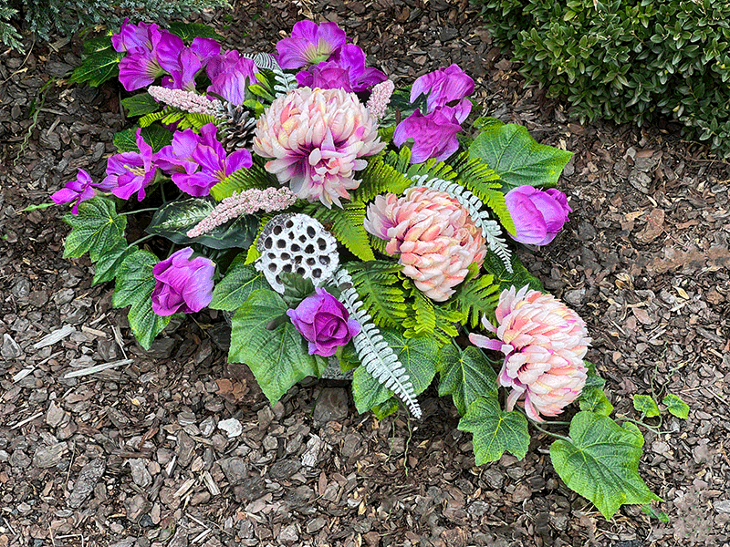 Gotowa kompozycja nagrobna osadzona jest w gipsie, dzięki któremu cały czas trzyma formę. Doniczka w kolorze złotym o średnicy 15 cm. Całość waży około 1300 g. Do wyboru Mają Państwo dwie wielkości kompozycji w wielu wariantach kolorystycznych.
