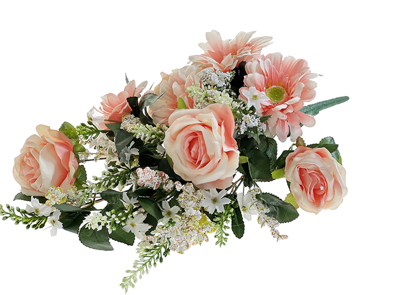 Okazały bukiet składający się z kwiatów gerbery , róży w otoczeniu wielu jasnych dodatków. Sprawdzi się jako gotowa ozdoba do wazonu lub do tworzenia innych kompozycji kwiatowych. Kształt lekko stożkowy idealny do wazonu nagrobnego. Duży wybór kolorystyczny.
