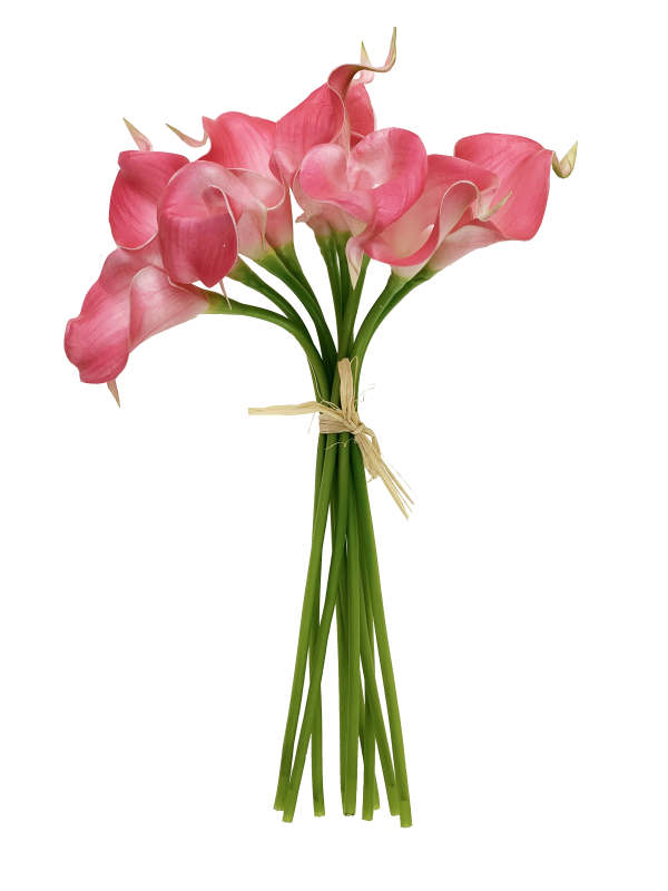 Kalia w pęczku w ilości 9 sztuk obwiązana kokardką. Materiał wysokiej jakości (gumowany) do złudzenia przypominający żywy kwiat zarówno wizualnie jak i w dotyku. Kolor różowy cieniowany. Wysokość 38 cm.