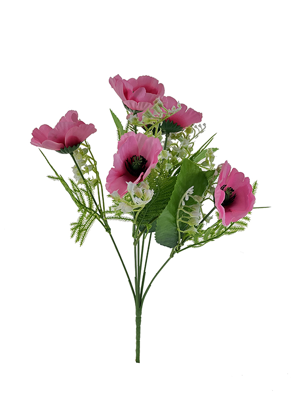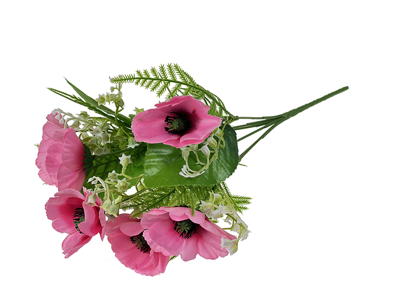 Bukiet sztucznych kwiatów o nazwie anemon z dodatkiem uroczej konwalii. Do wykorzystania jako gotowy produkt lub do tworzenia własnej dekoracji. Doskonała dekoracja kompozycji florystycznych i stroików, może stanowić element wspaniałych aranżacji. Polecamy wkład do wazonu z kratką, który przy wykorzystaniu kilku dodatków lub liści stworzy piękną kompozycję np. nagrobkową.