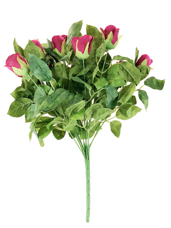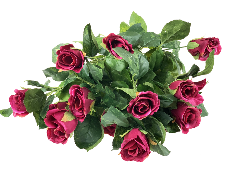 Duży bukiet 14 róż w kolorze ciemnego różu – fuksji. Cieniowane kolory i widoczne „krople rosy”. Wysokość bukietu 51 cm. Dobry jakościowo, wytrzymały materiał odporny na warunki atmosferyczne.