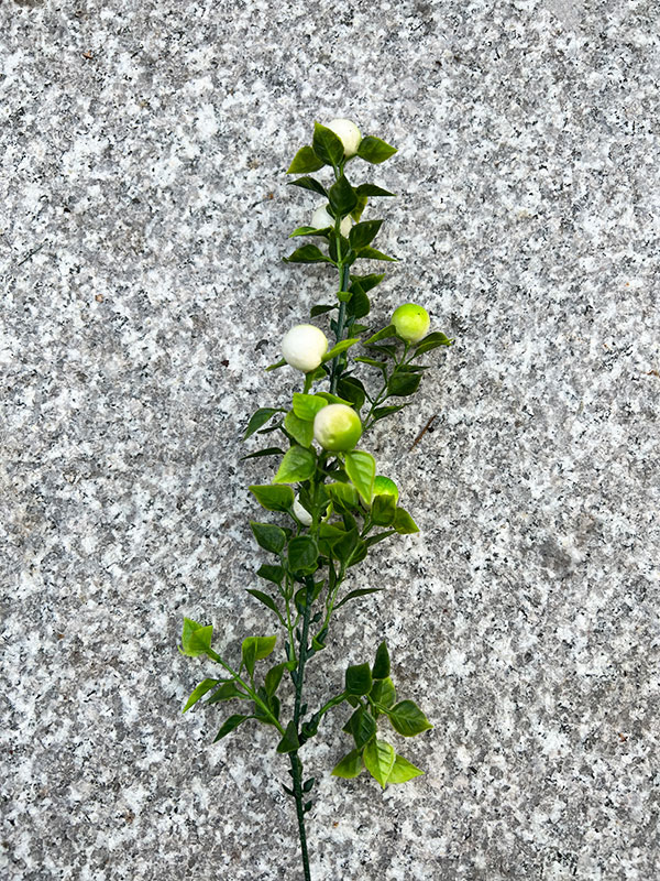 Gałązka z ozdobnym owocem w biało-zielonym kolorze. Piękny dodatek do wszelkiego rodzaju aranżacji i kompozycji z udziałem kwiatów i nie tylko. Cena dotyczy 1 szt. gałązki.