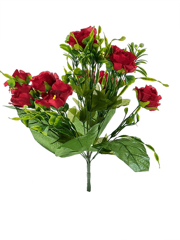 Bukiet składający się z 10 kwiatów. Są to gałązki róży w ilości 7 sztuk oraz 3 a`la storczyka z zielonymi dodatkami. Ilość zielonych dodatków w bukiecie oraz duże liście sprawiają ,że bukiet jest okazały. Idealny jako gotowy bukiet np. do wazonu nagrobkowego lub do cięcia i wykorzystania w innych kompozycjach kwiatowych.