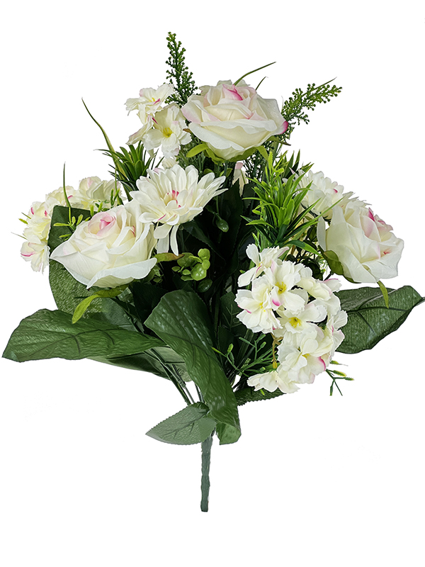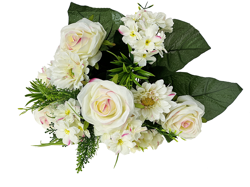 Śliczny bukiet mieszanych, sztucznych kwiatów takich jak róża, gerbera i hortensja w otoczeniu zielonych dodatków. Składa się z 18 gałązek kwiatowych oraz 5 dużych liści. Idealnie sprawdzi się w wazonie np. nagrobkowym jako gotowy bukiet lub do pocięcia i stworzenia swojej kompozycji kwiatowej. Dostępny w 6 różnych kolorach