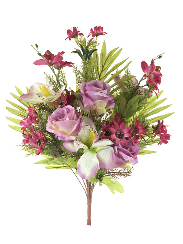 Duży okazały bukiet składający się z kilku rodzajów kwiatów. Trzy pąki róż , trzy storczyki w towarzystwie drobniejszych kwiatów z dużą ilością dodatków oraz liści. Możliwość rozłożenia i ułożenia kompozycji, kolor róż w kilku odcieniach. Do wykorzystania jako gotowy bukiet do wazonu lub do dalszego tworzenia innych kompozycji kwiatowych.