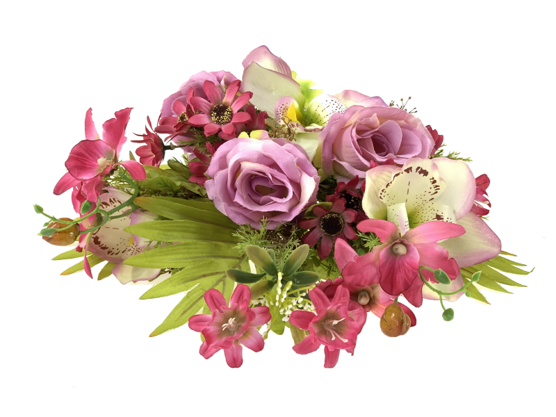 Duży okazały bukiet składający się z kilku rodzajów kwiatów. Trzy pąki róż , trzy storczyki w towarzystwie drobniejszych kwiatów z dużą ilością dodatków oraz liści. Możliwość rozłożenia i ułożenia kompozycji, kolor róż w kilku odcieniach.