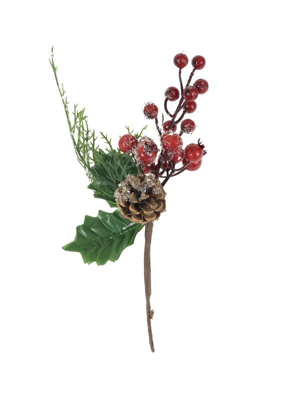 Świąteczny dodatek na piku idealny do wkomponowania w stroik, wianek lub inną świąteczną kompozycję. Szyszka sosny w otoczeniu zielonych dodatków i czerwonego głogu. Wysokość 24 cm