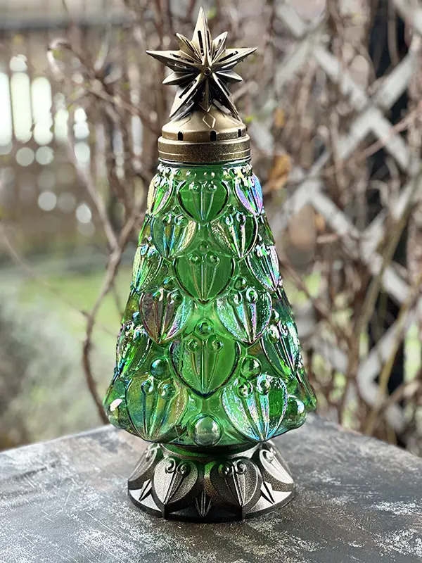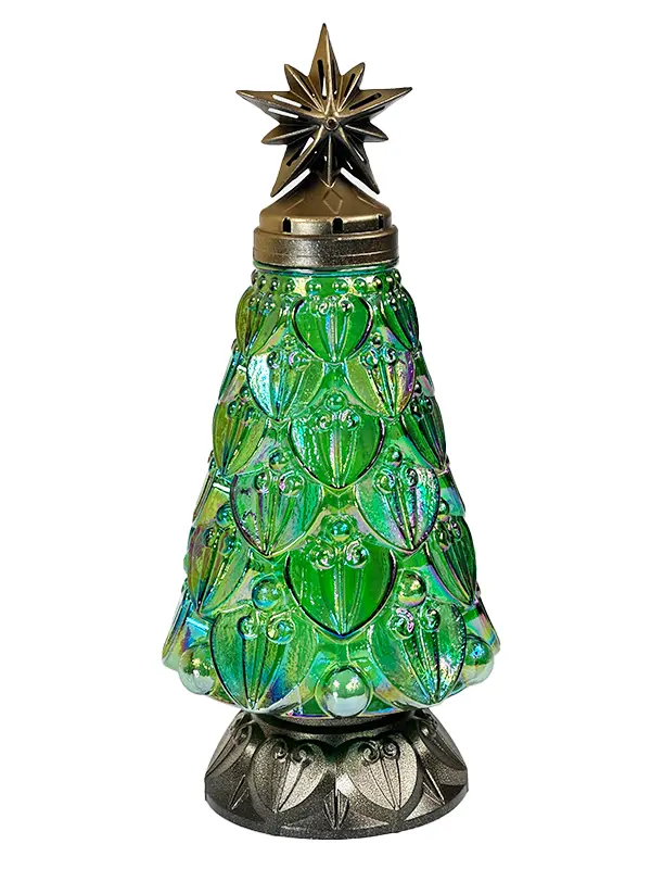 Bardzo duży i okazały znicz świąteczny w pięknym zielonym kolorze z dodatkiem brokatowych akcentów.