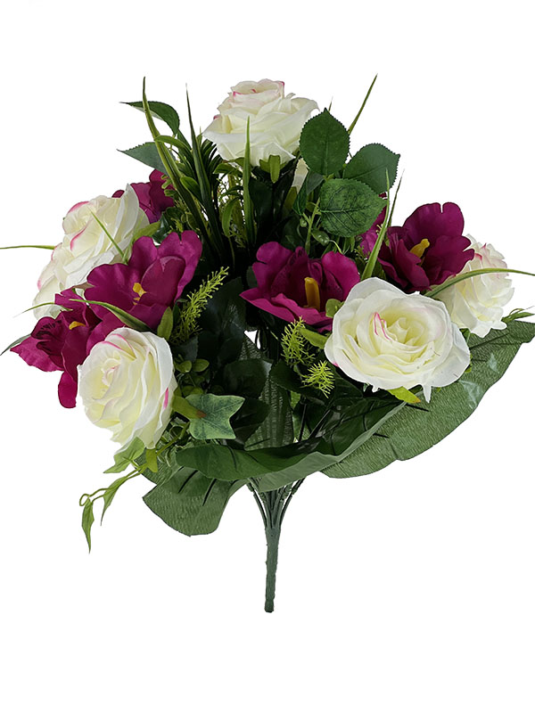 Duży bukiet mieszanych, sztucznych kwiatów takich jak róża i irys w otoczeniu zielonych dodatków. Młody liść bluszczu, asparagus i ozdobna trawa nadają bukietowi świeżość i lekkość.
