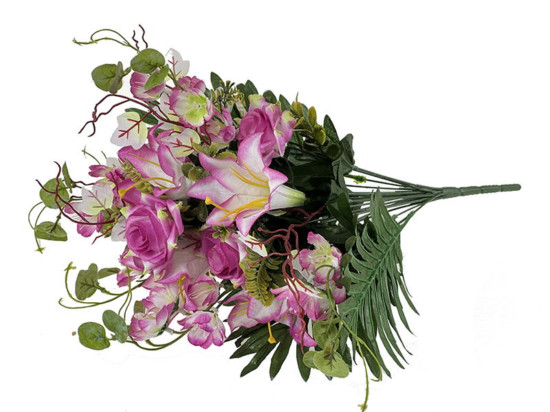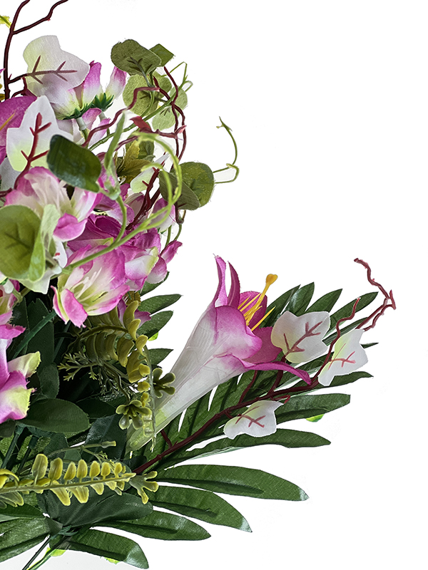 Okazały i obfity bukiet róży z lilią i ostróżką wzbogacony o zielone dodatki i liście. Do wykorzystania jako gotowa dekoracja wazonu nagrobkowego lub do uzupełniania stroików, wieńców, wiązanek itp. Bukiet można swobodnie formować, wyginać, dzielić i przycinać gałązki. Zaletą jest brak ryzyka zwiędnięcia pod wpływem niekorzystnych warunków atmosferycznych to główna zaleta, którą odznaczają się sztuczne w bukiecie. Dodatkowo nie tracą one innych walorów wizualnych, czyli rozmiaru, a także stabilności połączenia z pozostałymi częściami kompozycji.