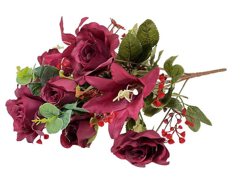 Okazały bukiet róży z lilią oraz fitonią dostępny w rożnych kolorach. Do wykorzystania jako gotowa dekoracja wazonu nagrobkowego lub do uzupełniania stroików, wieńców, wiązanek itp. Bukiet można swobodnie formować, wyginać, dzielić i przycinać gałązki. Brak ryzyka zwiędnięcia pod wpływem niekorzystnych warunków atmosferycznych to główna zaleta, którą odznaczają się sztuczne w bukiecie. Dodatkowo nie tracą one innych walorów wizualnych, czyli rozmiaru, a także stabilności połączenia z pozostałymi częściami kompozycji.