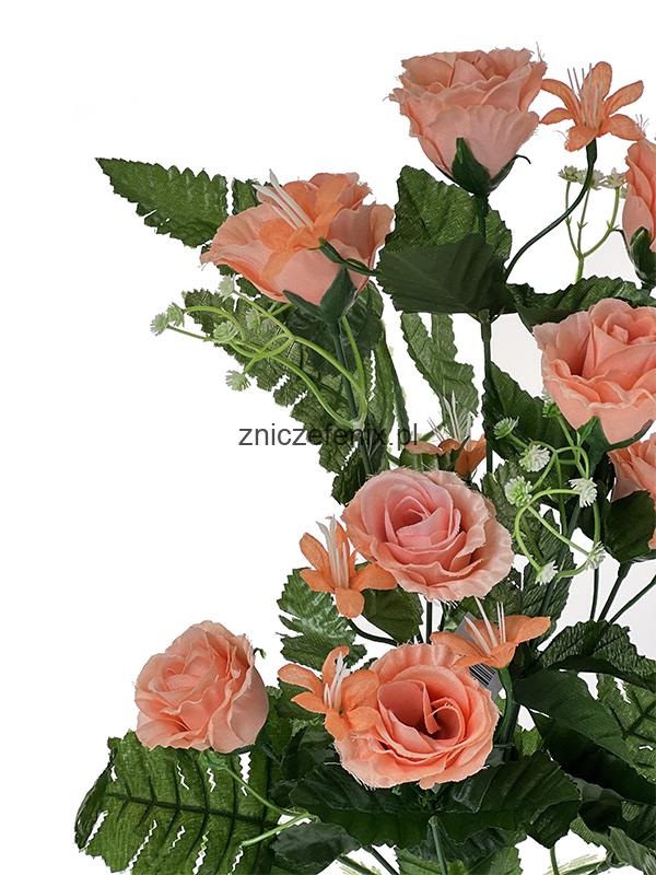 Bukiet sztucznych róż o stożkowym kształcie na paproci z dodatkiem delikatnej gipsówki i drobnych kwiatków.