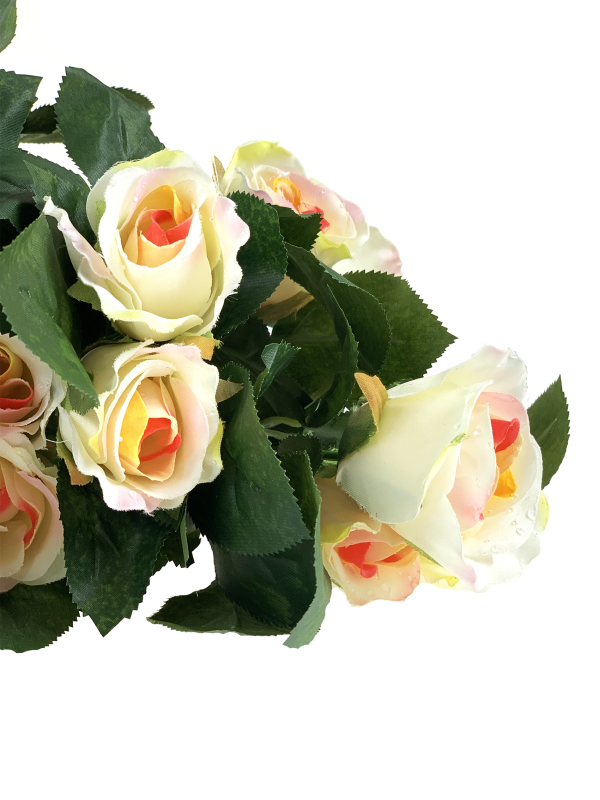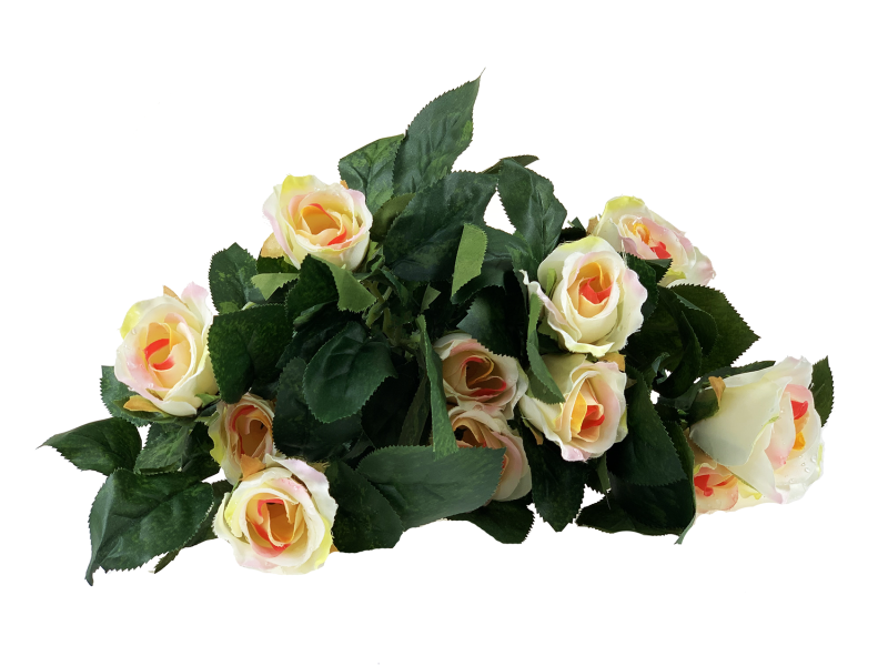 Duży bukiet 14 róż w kolorze herbacianym. Cieniowane kolory i widoczne „krople rosy”. Wysokość bukietu 51 cm. Dobry jakościowo, wytrzymały materiał odporny na warunki atmosferyczne.