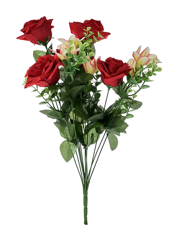 Bukiet mieszany z różą w pąku i dodatkiem mniejszych kwiatów. Składa się z 12 gałązek z zielonymi dodatkami. Idealny do nagrobkowego wazonu z uwagi na wysokość bukietu.