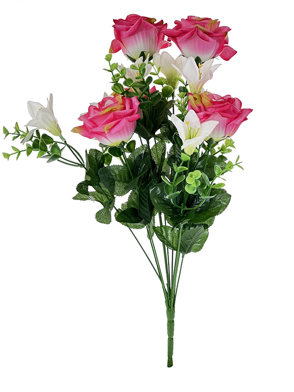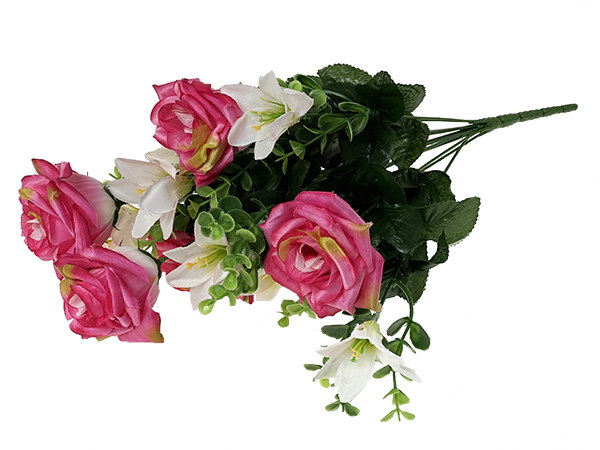 Bukiet mieszany z różą i dodatkiem mniejszych kwiatów. Składa się z 12 gałązek z zielonymi dodatkami. Idealny do nagrobkowego wazonu z uwagi na wysokość bukietu.