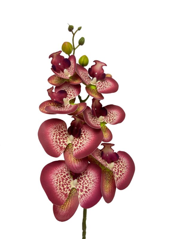 Dekoracyjna gałązka popularnego storczyka o długości 88 cm. Elastyczna łodyga dająca się wyginać, umożliwia ułożenie łodygi w pożądanym kształcie. Silikonowe kwiaty charakteryzują się delikatnym unerwieniem płatków oraz pięknym środkiem , który przyciągnie uwagę w każdej kompozycji. Produkt wysokiej jakości w 100 % oddający piękno żywego kwiatu.