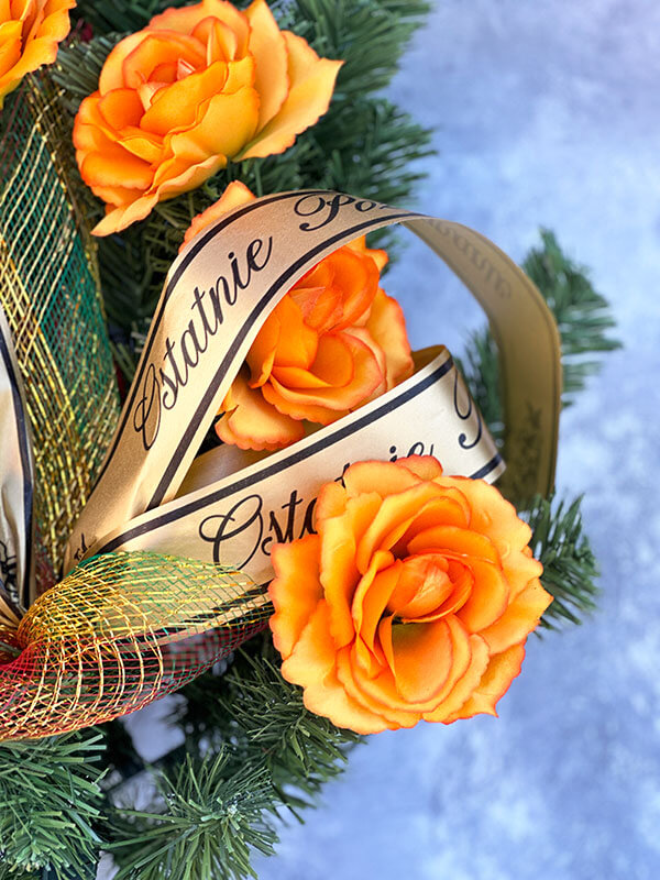- kwiaty: róża, imitacja świerkowych gałązek
