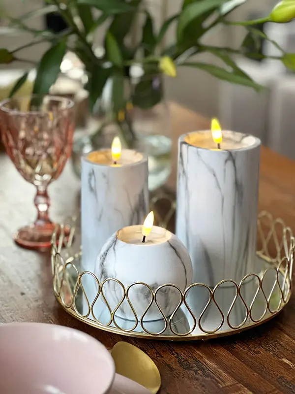 Świec Led imitująca marmur, atutem jest delikatnie migający płomień , który sprawia wrażenie prawdziwego ognia.