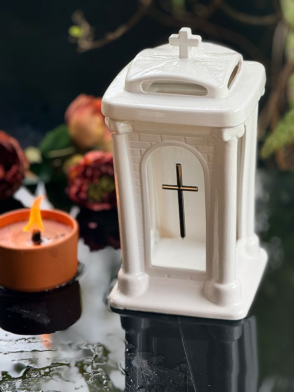 Znicz Kapliczka wykonany z czarnej ceramiki pokrytej błyszczącą glazurą, dzięki temu widoczny jest subtelny połysk. Warstwa wierzchnia chroni znicz również przed uszkodzeniami. Można stosować w nim wkłady elektryczne Led jak i klasyczne wkłady parafinowe.