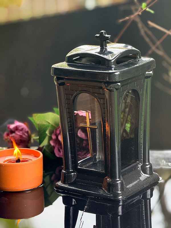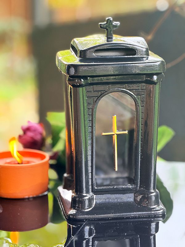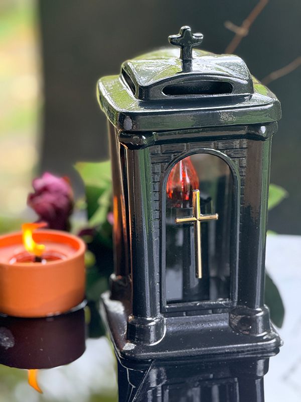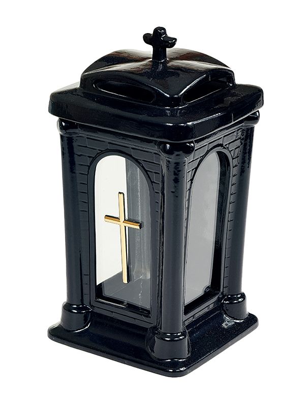 Znicz Kapliczka wykonany z czarnej ceramiki pokrytej błyszczącą glazurą, dzięki temu widoczny jest subtelny połysk. Warstwa wierzchnia chroni znicz również przed uszkodzeniami. Można stosować w nim wkłady elektryczne Led jak i klasyczne wkłady parafinowe.