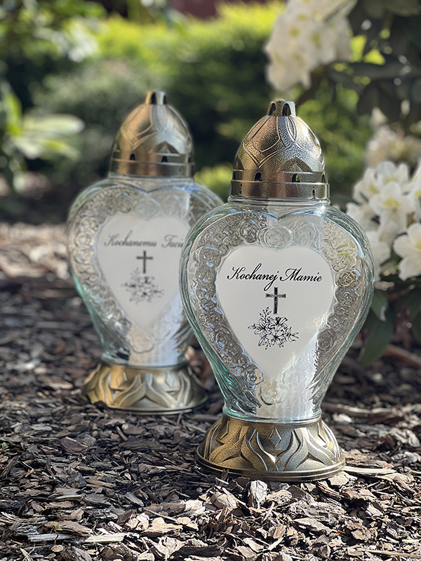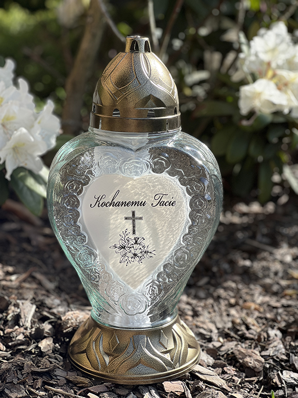 Znicz szklany z pięknym napisem “Kochanemu Tacie”. . Wkład wymienny w zestawie.