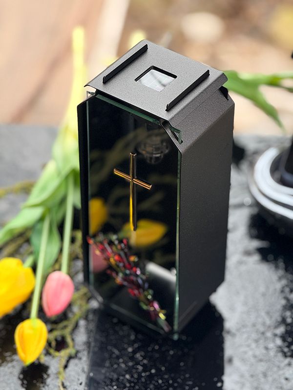 Znicz kapliczka metalowa solarna Aura z Krzyżem “żywy płomień”