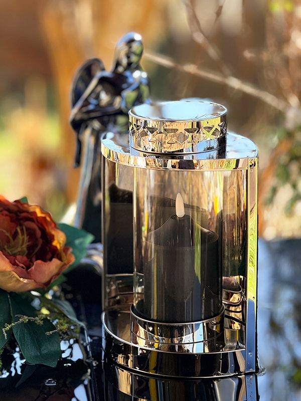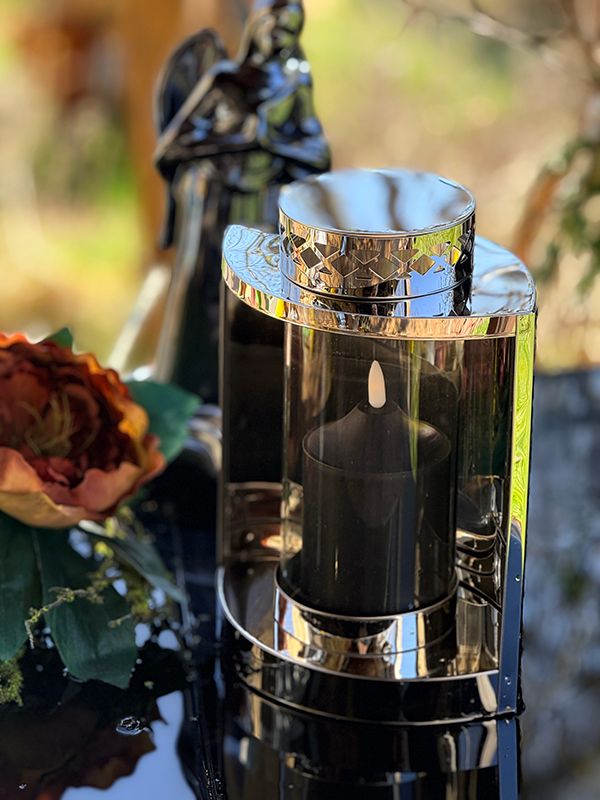 Sercem tego metalowego lampionu jest transparentna szklana tuba, która nie tylko chroni źródło światła, ale też pięknie je eksponuje. Abyś mógł cieszyć się blaskiem do zestawu dołączamy dopasowaną świecę LED.