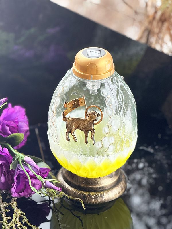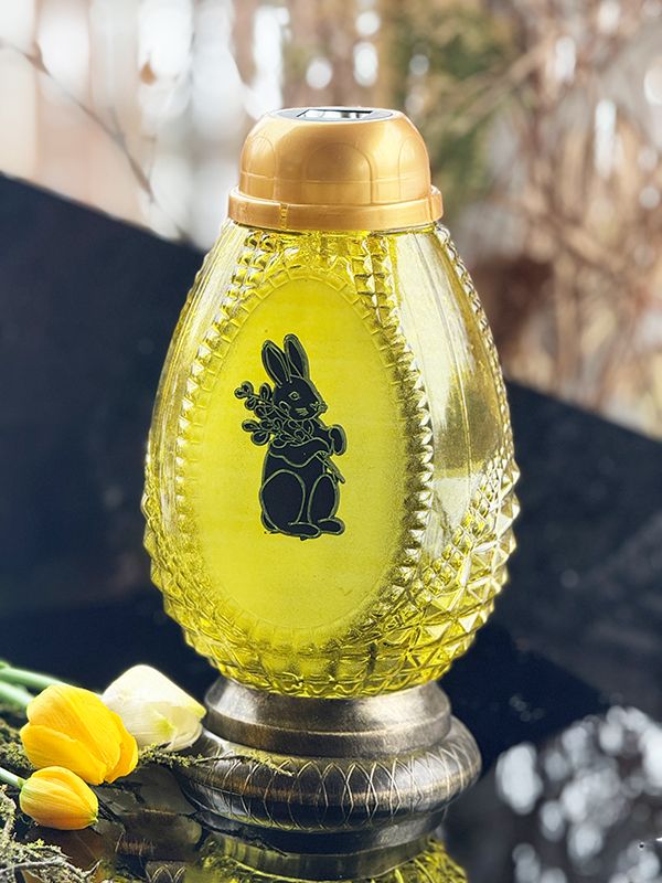 Znicz szklany solarny, wielkanocny o białej barwie światła.