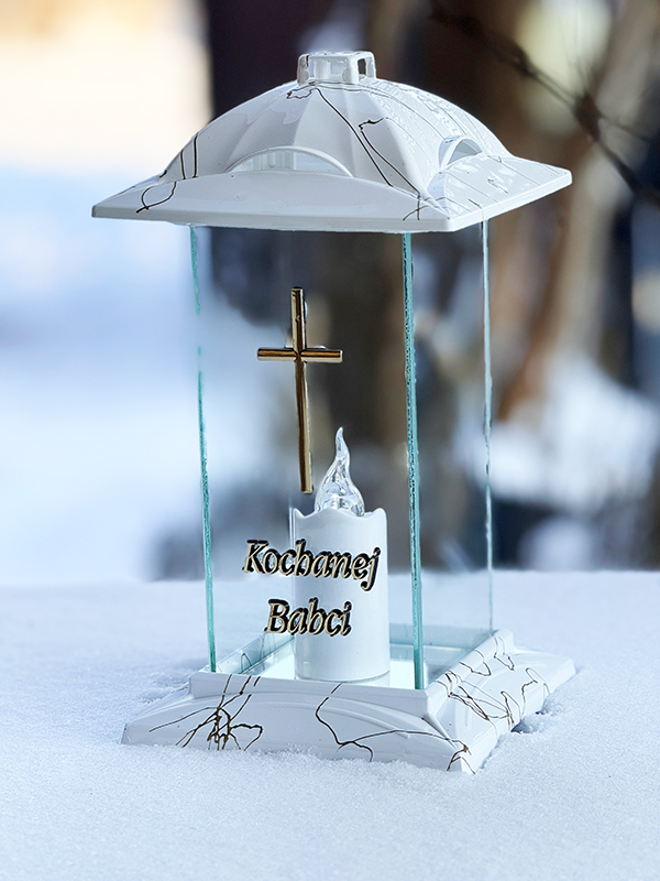 Znicz szklany, klasyczny z wkładem Led z sentencją Kochanej Babci. Możliwość stosowania również wkładów klasycznych .