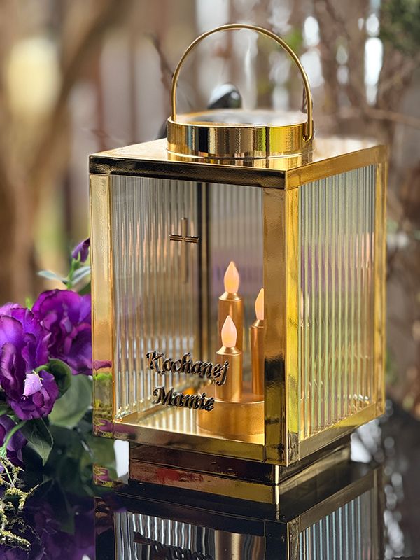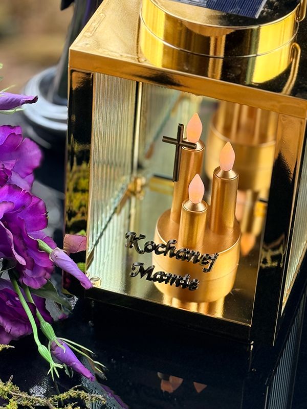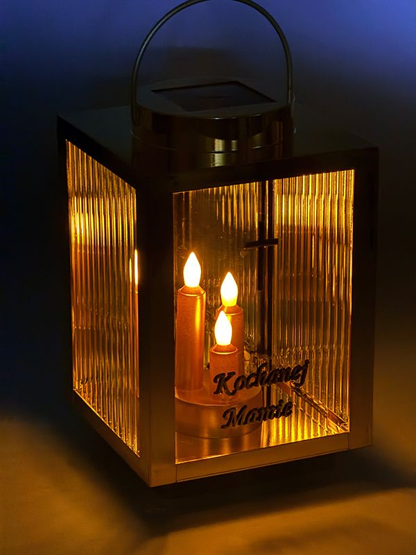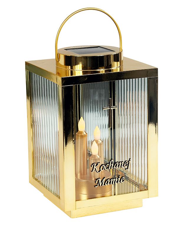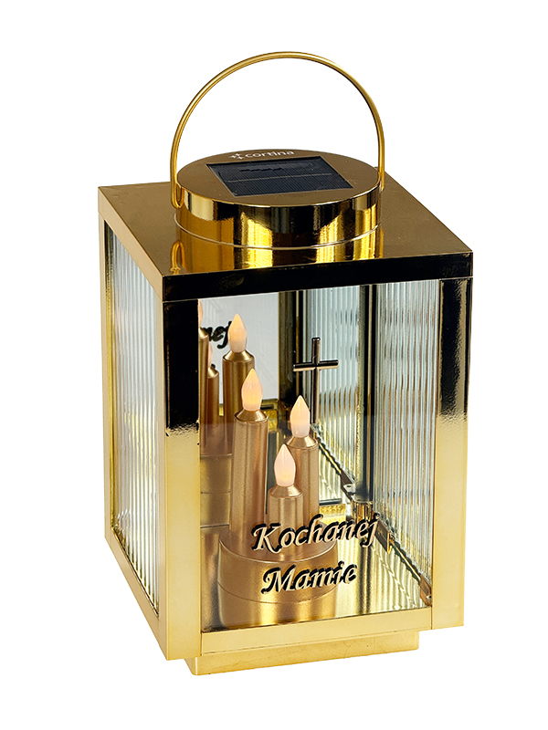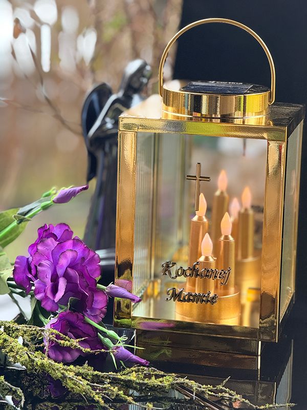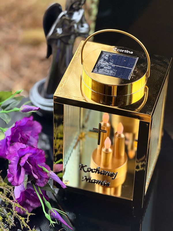 Ten lampion solarny w kolorze złotym wykorzystuje energię słoneczną. Wbudowany panel fotowoltaiczny samoczynnie ładuje akumulator w ciągu dnia. Nie musisz martwić się o baterie czy rozlany wosk. Dzięki metalicznemu wykończeniu, znicz prezentuje się wyjątkowo godnie na każdym nagrobku. Nowoczesny kolor nadaje zniczowi wyjątkowy charakter, idealnie komponując się z granitem czy marmurem. Migoczące Diody LED w postaci potrójnej świecy świeci się przez całą dobę. To piękny symbol niegasnącej pamięci z sentencją “Kochanej mamie”.