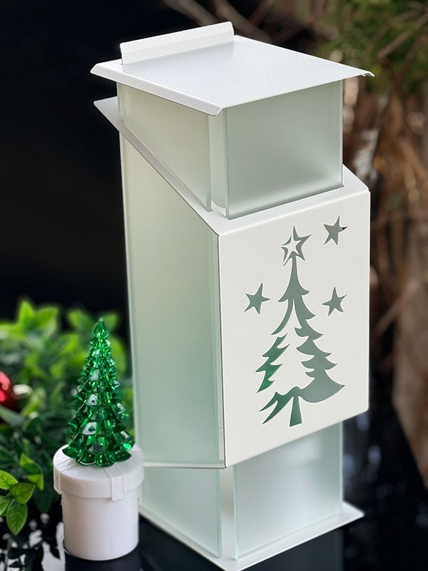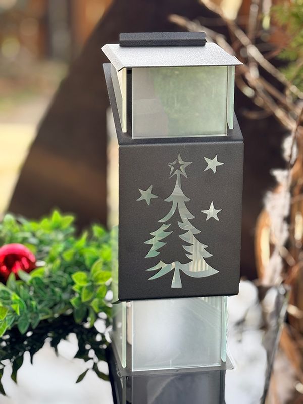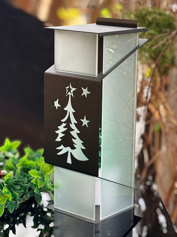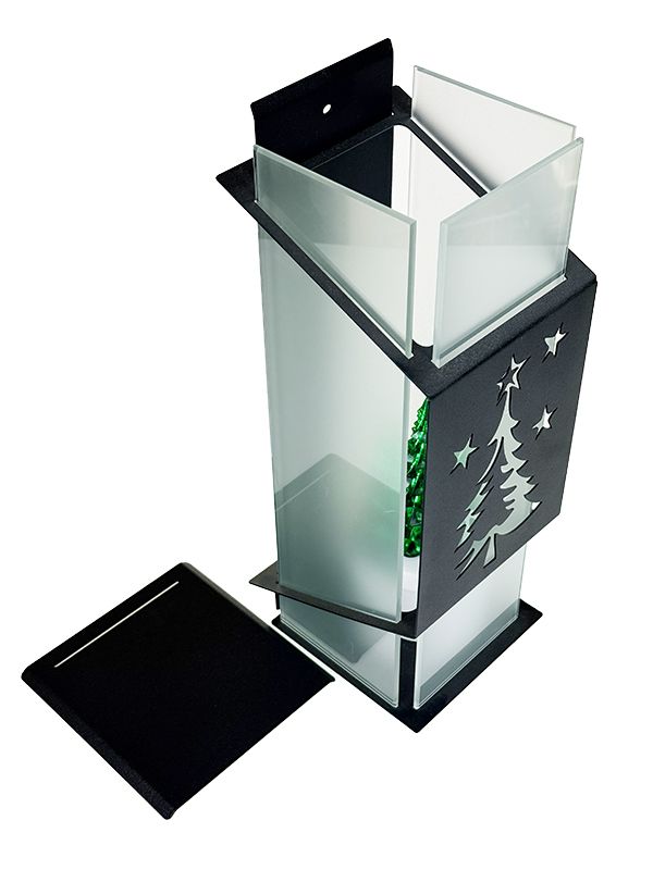- Elegancki design: Znicz składa się z metalowej czarnej obudowy oraz trzech szklanych (mlecznych) ścianek , które rozpraszają światło, tworząc spokojną i ciepłą atmosferę. Na przodzie znajduje się subtelny motyw Choinki, dodający kapliczce wyjątkowego świątecznego charakteru.