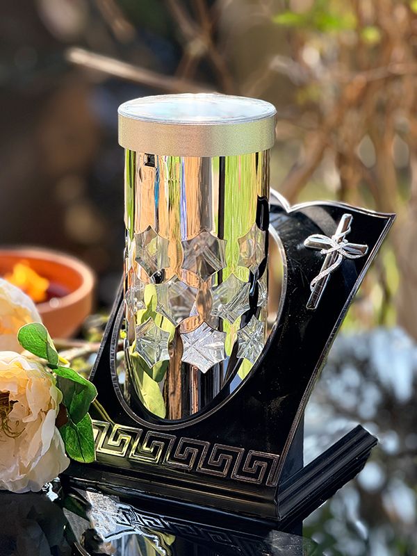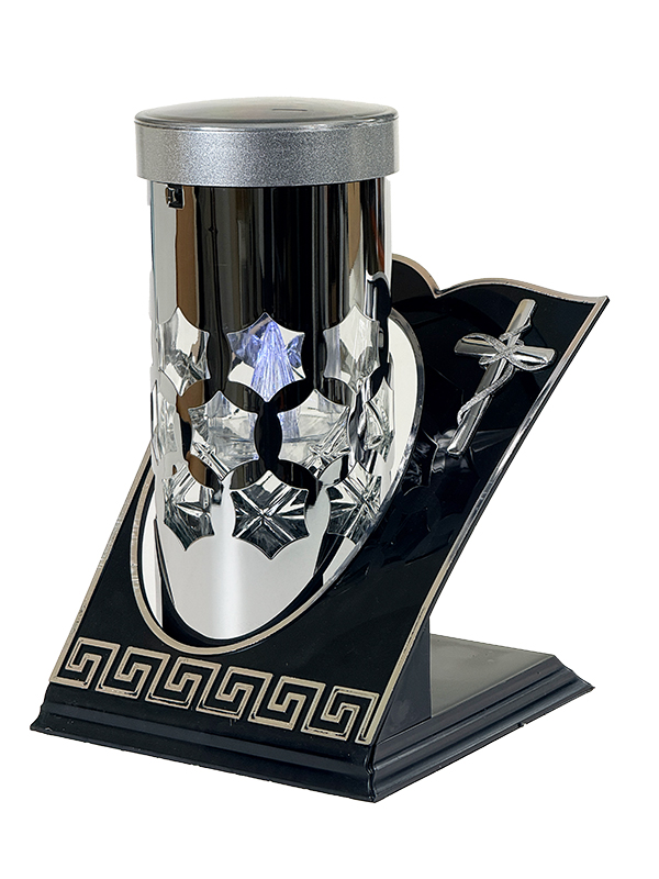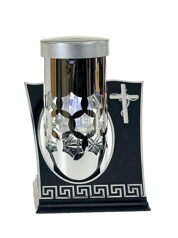 Znicz solarny całodobowy Meander Srebrny krzyż/Białe światło