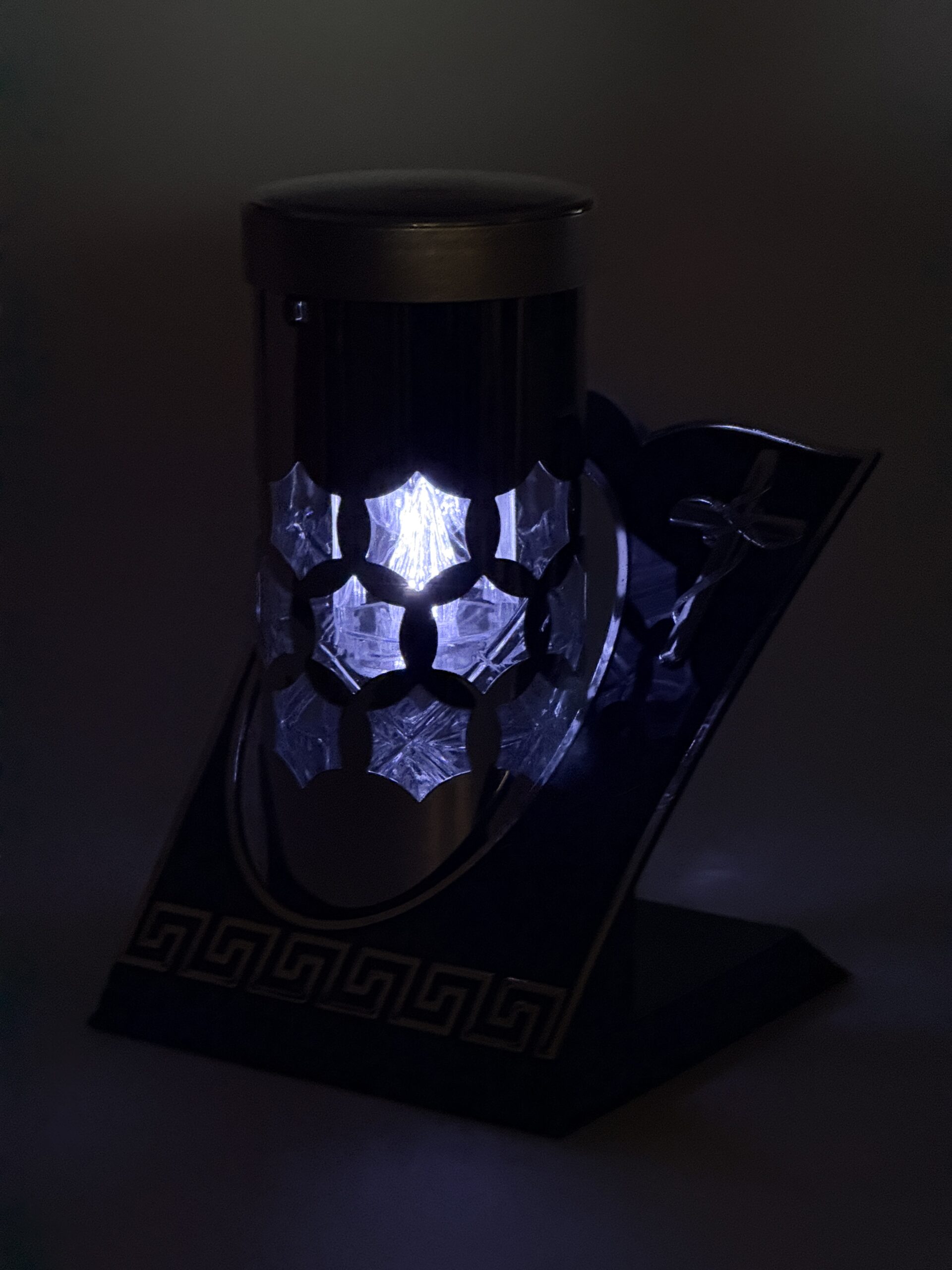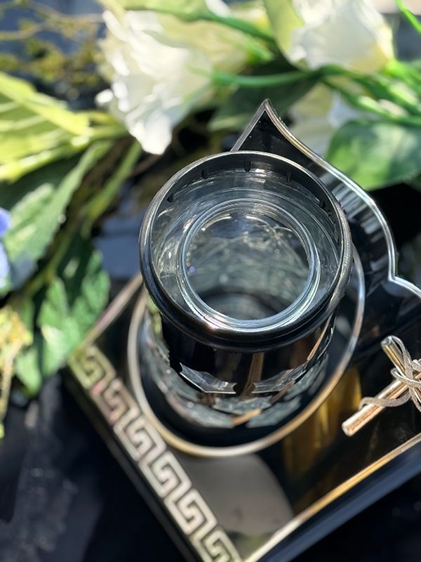 Znicz osadzony jest na zdobnej podstawie, którą wzbogacono o lśniące, srebrne elementy, nadające mu prestiżowego charakteru. Serce znicza stanowi szklana tuba, wewnątrz której umieszczono teleskopowy wkład imitujący płomień z białym efektem migotania. Dzięki możliwości regulacji wysokości, możesz idealnie dopasować wygląd światła do swoich preferencji. Emitowany blask w kolorze biało nadaje nagrobkowi wyjątkowego, podniosłego charakteru, a zasilanie solarne gwarantuje, że symboliczne światełko będzie czuwać nad bliskimi przez całą dobę – bez konieczności wymiany wkładów.