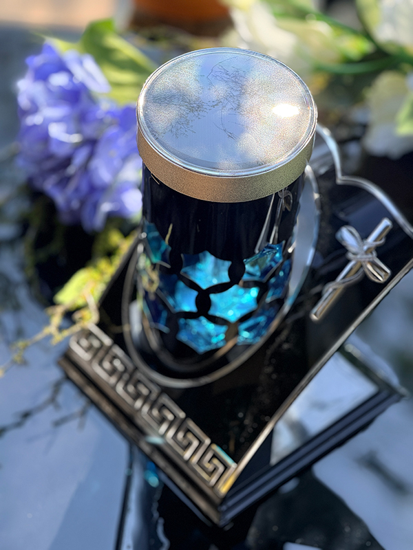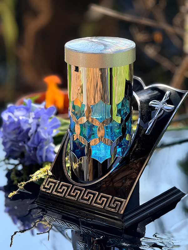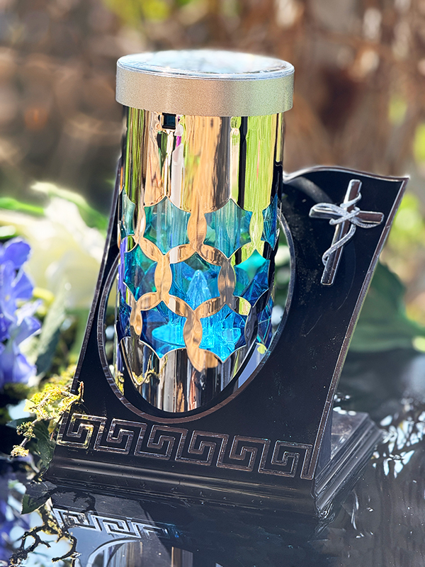 Znicz osadzony jest na zdobnej podstawie, którą wzbogacono o lśniące, srebrne elementy, nadające mu prestiżowego charakteru. Serce znicza stanowi szklana tuba, wewnątrz której umieszczono teleskopowy wkład imitujący płomień z NIEBIESKIM efektem migotania. Dzięki możliwości regulacji wysokości, możesz idealnie dopasować wygląd światła do swoich preferencji. Emitowany blask w kolorze biało nadaje nagrobkowi wyjątkowego, podniosłego charakteru, a zasilanie solarne gwarantuje, że symboliczne światełko będzie czuwać nad bliskimi przez całą dobę – bez konieczności wymiany wkładów.