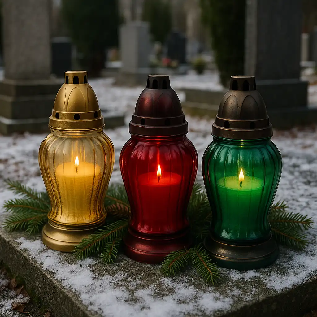 Wybór zniczy w tym okresie ma znaczenie. Zimowa sceneria wymaga kolorów, które nie zginą w bladym świetle, lecz podkreślą elegancję miejsca. Złoto, głęboka czerwień, butelkowa zieleń – te barwy naturalnie komponują się z charakterem świąt i otoczeniem cmentarza.
