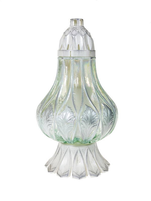 Szklany znicz na wkład wymienny o wysokości 36 cm. Wyjątkowy wzór szkła ozdobiony jasnymi kolorami w odcieniu perłowym.