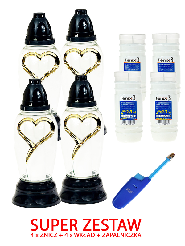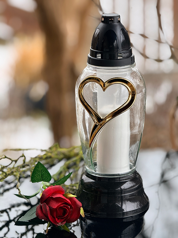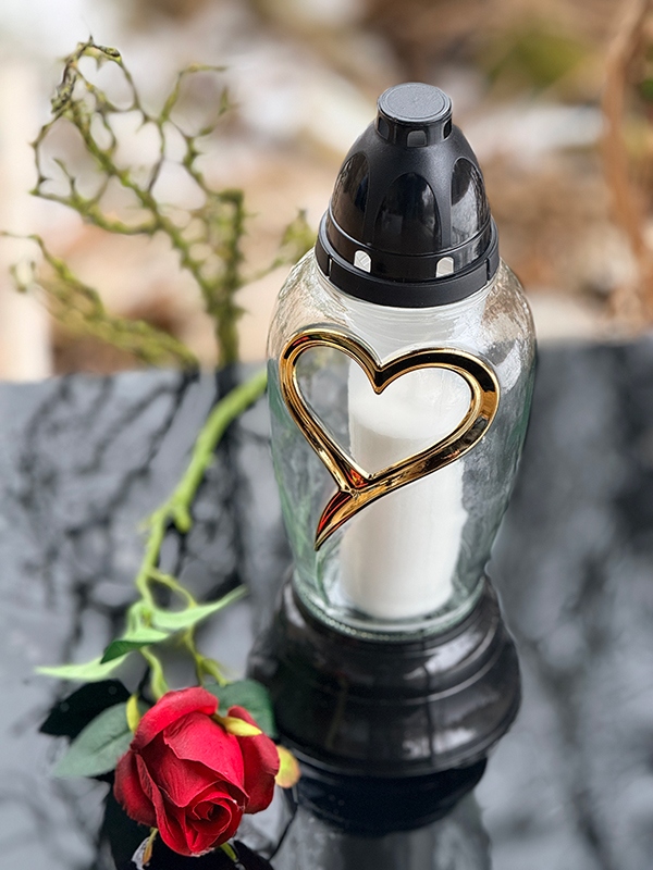 4 x Elegancki znicz szklany: Wykonany z grubego szkła, zdobiony subtelnym złotym detalem w kształcie serca, który nadaje mu wyjątkowego charakteru. Każdy znicz posiada standardowy wkład wymienny na start.