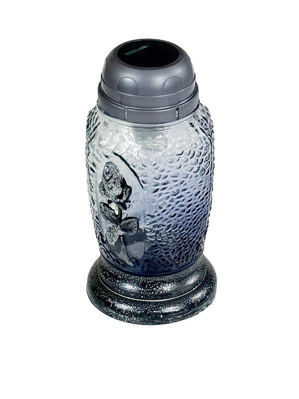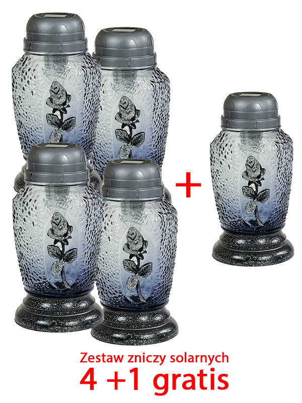 Zestaw zawiera 5 sztuk zniczy solarnych (4 +1 gratis). Elegancki grafitowy znicz z posrebrzaną podstawką rozświetli pamięć o bliskich przez wiele miesięcy. Urocza aplikacja róży z brokatem, ostatnie niepowtarzalne sztuki.
