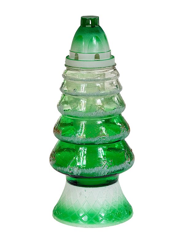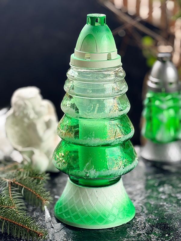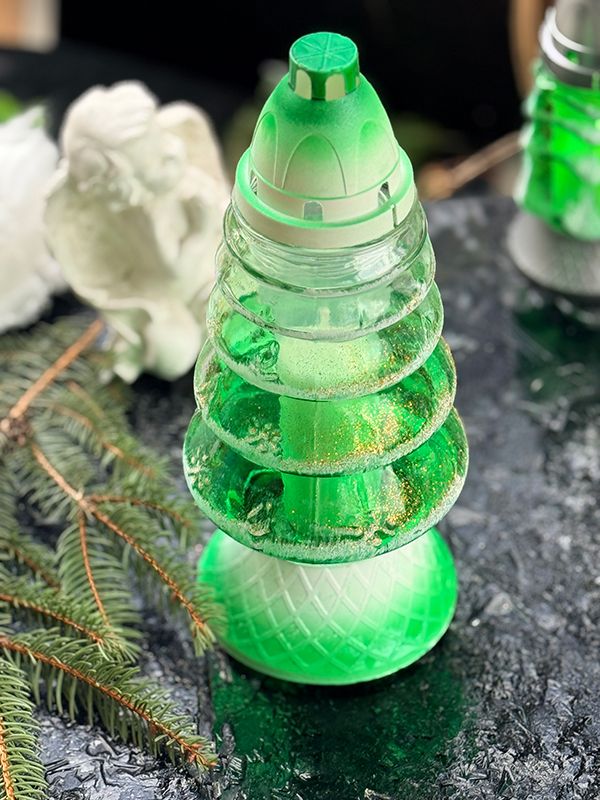 Znicz okolicznościowy w kształcie choinki na wkład parafinowy. Oryginalne cieniowanie na szkle oraz plastikowych elementach.