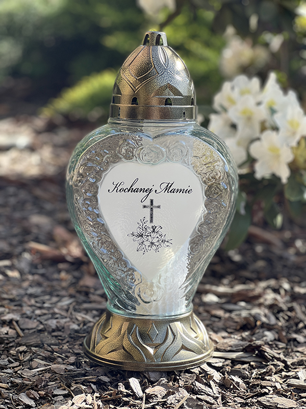 Znicz szklany z pięknym napisem “Kochanej Mamie”. Dodatki w kolorze złotym. Wkład wymienny w zestawie.