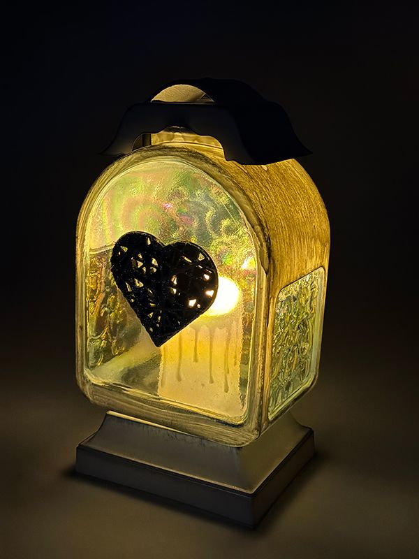 Wyjątkowy znicz artystyczny wykonany ze szkła tęczowego z pięknym ornamentem oraz świecą w zestawie.