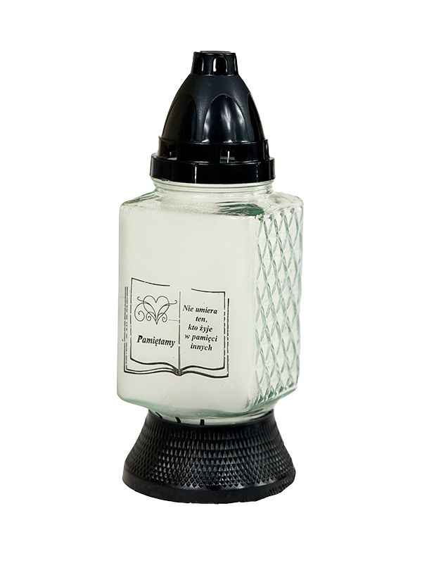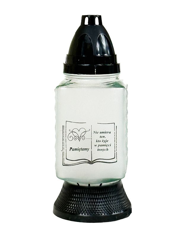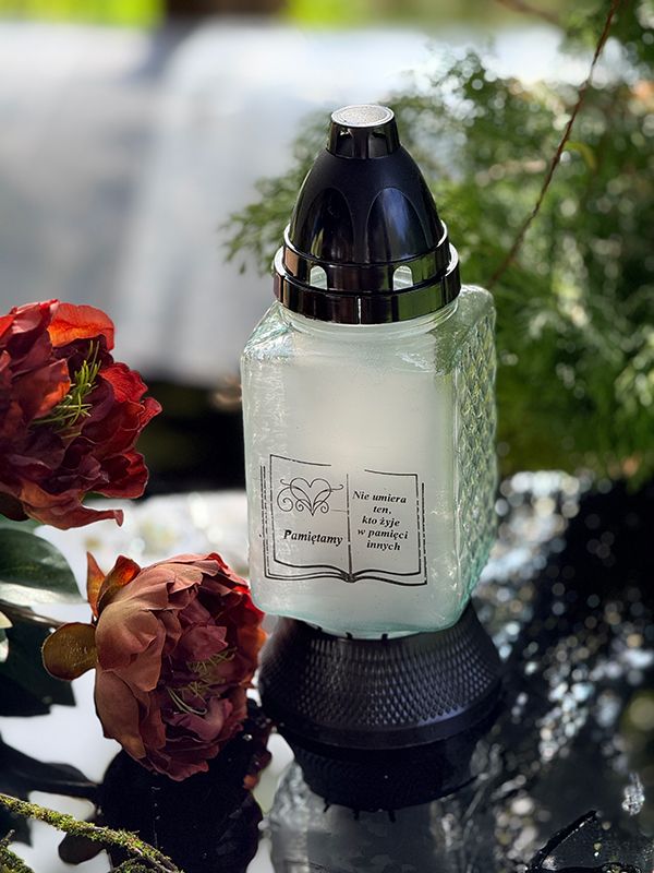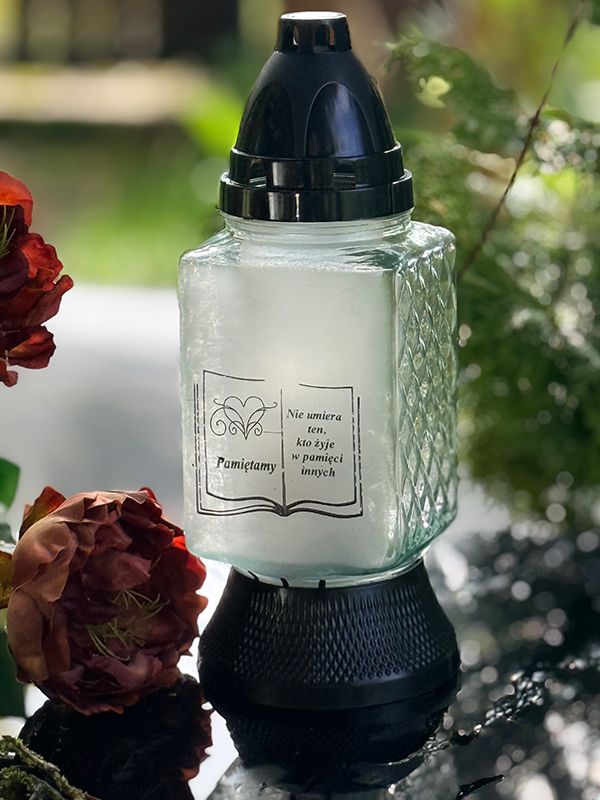 Klasyczny znicz z tradycyjnym wkładem i piękną sentencją z przodu- ” Pamiętamy – Nie umiera ten kto żyje w pamięci innych”