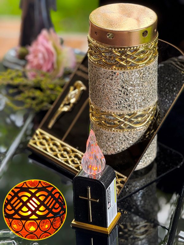 Znicz Lampion Witraż Dekor Akryl +ŚWIECA LED Memorial Złota Mozaika Szklana