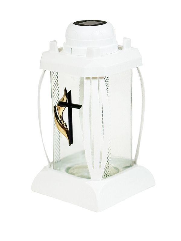 Znicz Solarny Kapliczka Prima1 Biała Krzyż + Ogień złoty (24cm)